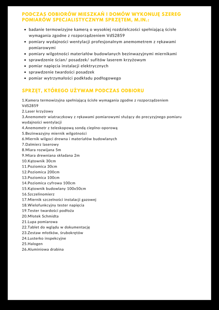 • Możliwość kontaktu ze mną po wykonanym odbiorze i zadawania dowolnych pytań technicznych związanych z odbieraną nieruchomością, remontem